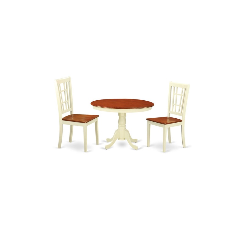 This round small kitchen table set will definitely bring in a remarkable touch for the dining room through its dark slick facets. Each of our circular dining table features a 42″ width, a 30″ height, as well as a little extra room for your extra dinner visitor. The entire stylized dining room chairs have a horizontal back panels, for a rather simple and harmonious style. The particular round dining room tables in addition to matching linen white dining room chairs supply you with loads of comfort along with giving you that clean finish. The round dining table consists of an in depth pedestal that branches apart directly into four curved legs for good looks and physical assistance. 3 pc Hartland set with one round 42in small table and 2 dinette chairs with wood seats in a beautiful buttermilk and cherry finish.