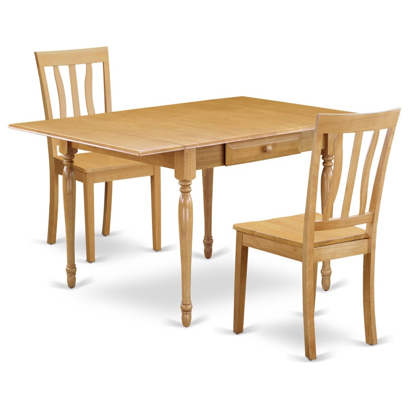 East West Furniture MZAN3-OAK-W 3Pc Dinette Sets for Small Spaces Contains a Wood Table and 2 Dining Chairs with Solid Wood Seat, Drop Leaf Table with Slat Back Chairs, Oak FinishModify your house into a home with this exclusive and sophisticated MZAN3-OAK-W wood dining table set. This amazing dining room table set offers a stylish appearance to enrich any kind of dining room or residence’s kitchen area for any functions. The convenient 3 pieces dinette set includes a small dining table and two dining chairs. The rectangle-shaped hardwood table finished in oak is made from top-rated quality rubberwood known as Asian hardwood. The wood table includes two 9-inch drop down leaves that provides additional space for extra food trays and drinks. The 2 drawers of the dining table provide additional storage to help keep you organized. The easy to assemble wood table ensures pleasure and long-lasting use. The stunning modern dining chairs offer a hardwood top to get an exquisite and modern look. These modern dining chairs come with a solid wood seat to fit personal preference and perfect design. The 3 vertical slats give any kitchen area a touch of class and sophistication. Made up of solid wood, the dining chairs are stable and offer a sturdy finish. The frame of the kitchen chairs is engineered to offer a great amount of comfort to your spine and thus reduce the chances of back pain. The matching color of the dining chairs set with the table brings a good contrast in the kitchen area. The standard shape, size and design make the dining area significantly attractive. This contemporary, affordable, long-lasting and comfortable dining set can be a good choice if you are looking for a great dining time experience with your family or friends. Table Specifications: Material: Asian Hardwood Color: Oak Dimensions: Length 36 extendable to 54; Width 36; Height 30Chair Specifications: Material: Asian Hardwood Cushion Material: Foam Color: Oak Dimensions: Length 21; Width 17; Height 36 Weight Capacity: 300 lbs Includes: 1 x Rectangular Table 2 x Faux Leather Chair N.B.: Hardware package and instruction manual is located in/under the seat.
