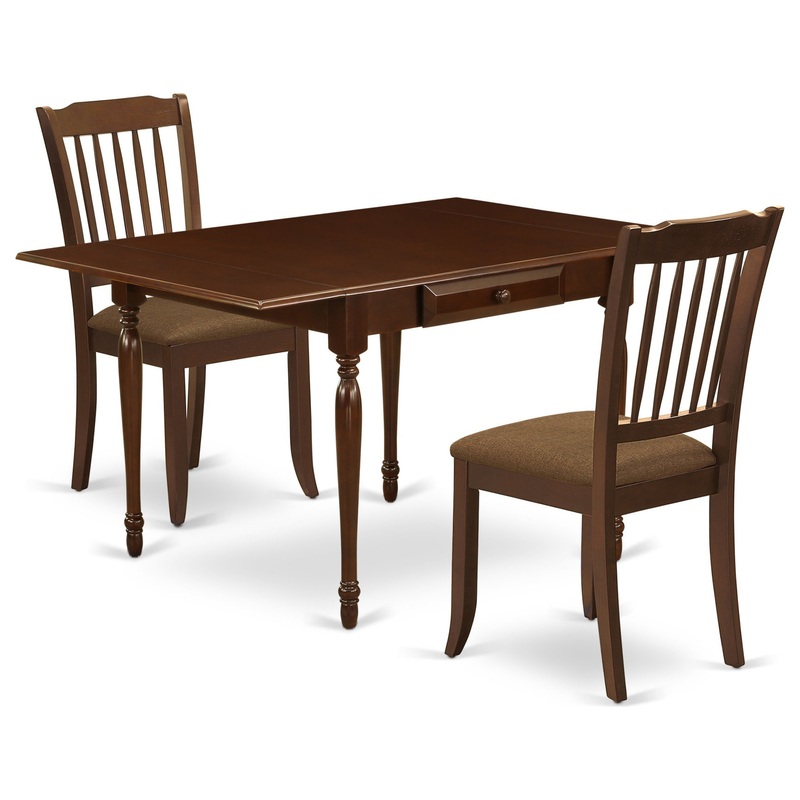 East West Furniture MZDA3-MAH-C 3Pc Dinette Sets for Small Spaces Offers a Dining Room Table and 2 Modern Dining Chairs with Microfiber Upholstery Seat, Drop Leaf Table with Slat Back Chairs, Mahogany FinishFurnish your dining area with this fashionable MZDA3-MAH-C dining table set to get an amazing and classy look. Crafted in the transitional style for your casual dining area, the kitchen set will be a welcome area for your family and friends to gather during meals and social activities. The comfortable 3 pieces dining room table set contains a dining table and two Microfiber upholstery dining chairs. Manufactured from Asian tropical hardwood also known as rubberwood, the rectangle table finished in Mahogany has smooth edges and designed round legs for a fancy style. The kitchen table integrates two 9-inch drop down leaves that provides additional space for extra food trays and drinks. The 2 drawers of the dining table provide additional storage to help keep you organized. The easy to assemble kitchen table ensures comfort and long-lasting use. The eye-catching Danbury cushioned upholstery dining chairs finished in smooth Mahogany color offer a modern look in your dinette space. The dining room chairs come with a Microfiber upholstery cushioned seat to fit personal preference and perfect design. The Stylish kitchen chairs feature curved front legs. The 7 vertical slats give any dining area a touch of class and sophistication. Made up of hardwood, the dining chairs set is stable and offers a sturdy finish. The upholstered kitchen chairs add elegance and class to any place you have placed them. The frame of the dining chairs set of 2 is engineered to offer a great amount of comfort to your spine and thus reduce the chances of back pain. The matching color of the wooden dining chairs with the dining table brings a good contrast in the kitchen area. The standard shape, size and design make the dinette area significantly attractive. This contemporary, budget-friendly, durable and comfortable kitchen table sets can be a good choice if you are looking for a great dining time experience with your family or friends. Table Specifications: Material: Asian Hardwood Color: Mahogany Dimensions: Length 36 extendable to 54; Width 36; Height 30 Chair Specifications: Frame Material: Asian Hardwood Fabric: Microfiber Fabric Cushion Material: Foam Fabric Color: Chair Finish: Mahogany Dimensions: Length 21; Width 18; Height 38 Weight Capacity: 300 lbs Includes: 1 x Rectangular Table 2 x Microfiber seat Chair N.B.: Hardware package and instruction manual is located in/under the seat.