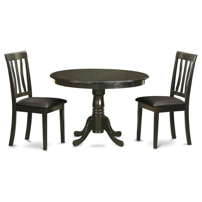 This 3 piece dinette kitchen table set includes one dinette round table 42 in dimension with 2 drop leaves and 2 slat back with faux leather seat chairs in an elegant Cappaccino finish.