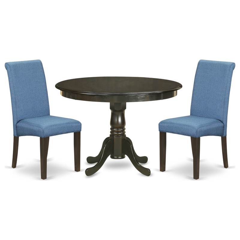 HLBA3-CAP-21 3Pc Small Round table with linen Blue fabric Parson chairs with cappuccino chair legsThis particular HLBA3-CAP-21 dining set will apply a remarkable atmosphere to your kitchen space through its dark slick facets. The round small dining table p