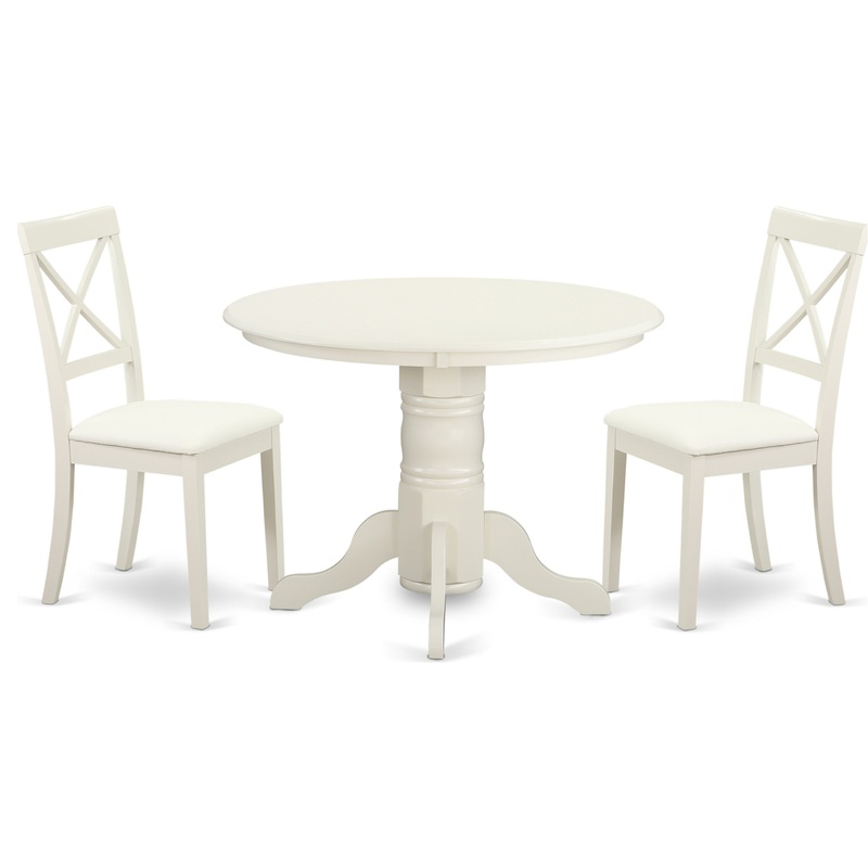 Lighten up a dining area or generate a comfortable dining space in a kitchen with this type of 3 piece dining table set. This set consists of a round pedestal table and 2 sheaf back style dinette chairs with faux leather seat. The Linen White finish adds an excellent country cottage or shabby chic look to any dining room or kitchen space. This round table is great for kitchens or dining rooms. Its compact size makes it suitable for apartments, condos or other small spaces.