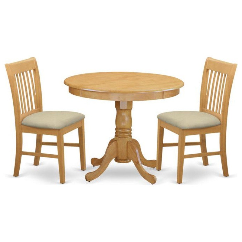 -Package Includes: 3 Piece Small round kitchen area table with 2 kitchen chairs finish in a warm oak color with microfiber upholstery seat.