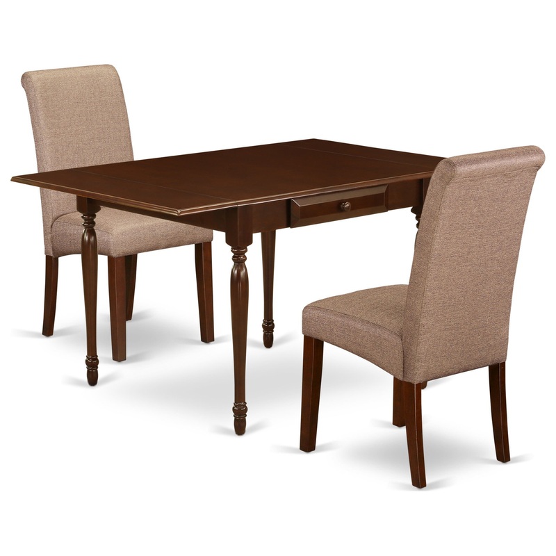 East West Furniture MZBA3-MAH-18 3Pc Dining Room Table Set Consists of a Small Kitchen Table and 2 Upholstered Dining Chairs with Brown Linen fabric Color Linen Fabric, Drop Leaf Table with Full Back Chairs, Mahogany FinishModernize your kitchen room with this simple yet multi-functional MZBA3-MAH-18 dining set. This distinctive dining table set provides a trendy look to enrich any type of dining room or home’s dining area for any events. The useful 3 pieces dining table set for 2 contains a dinette table and two parson chairs. Manufactured from Asian tropical hardwood also known as rubberwood, the modern dining table finished in Mahogany has smooth edges and fashioned round legs for a fancy style. The drop leaf table integrates two 9-inch drop down leaves that provides additional space for extra food trays and drinks. The 2 drawers of the dining table provide additional storage to help keep you organized. The drop leaf table can be assembled without any extra tools and aim to last for long. You need a fashionable and cost effective dining room chair to match your kitchen table. The Barry upholstered parsons dining room chairs is a tasteful, well-made seating solution. The parsons dining chair features a beautiful stitched exterior. Tall back, upholstery, rolled back, high-density foam padding, solid hardwood frame construction, and linen upholstery make these parsons chairs comfortable, durable and attractive. Whether you use this chair in your dining area, kitchen, office or basement, it is an easy to assemble and stylish answer to your seating needs. The conventional parson gives these wooden dining chairs a touch of familiar charm, while the linen fabric in Brown color and clean-lined design elevate this dining chair with a modern flair. This contemporary, cost effective, durable and comfortable dining set can be a good choice if you are looking for a great dining time experience with your family or friends.Table Specifications: Material: Asian HardwoodColor: MahoganyDimensions: Length 36 extendable to 54; Width 36; Height 30Chair Specifications:Frame Material: Asian HardwoodFabric: Linen FabricCushion Material: FoamFabric Color: BrownLeg Color: MahoganyDimensions: Length 25.5; Width 19; Height 42Weight Capacity: 300 lbsIncludes:1 x Rectangular Table2 x Parson ChairN.B.: Hardware package and instruction manual is located in/under the seat.