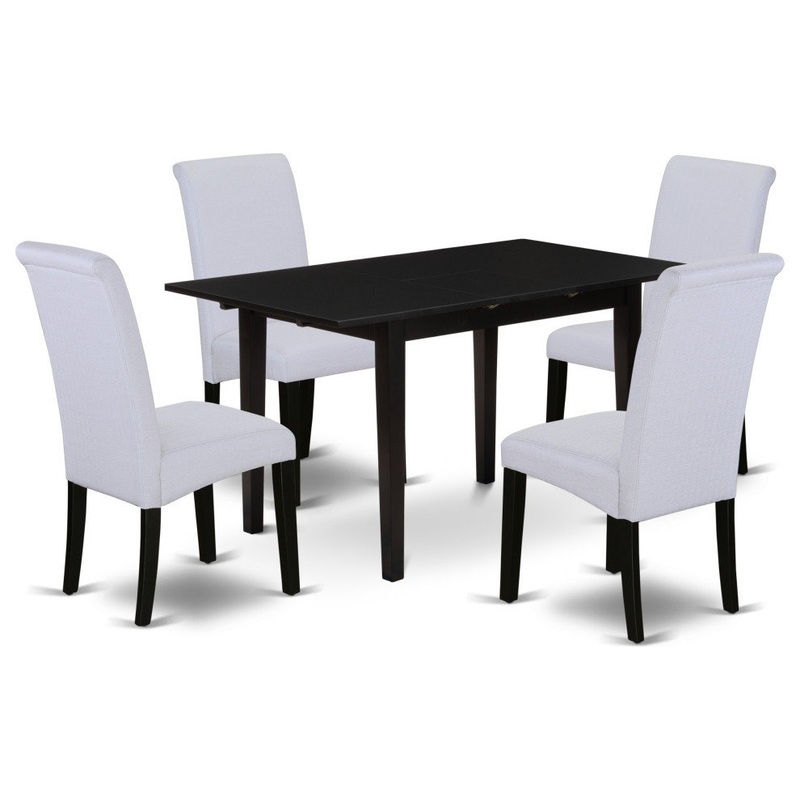 This wood dining table set includes 4 beautiful dining room chairs and an incredible 4 legs dinette table. The rectangular dining table set provides a Black solid wood dinette table and fantastic dining room chairs that will increase the elegance to your dining area. This dining table is created from high-quality rubber wood. These parson chairs have made of good quality wood that can Endurance to 300lbs weight. This wooden dining table set is colored with a good quality Black finish. The wood dinette set is one of the most important pieces of furniture in your house. It not only becomes the place to eat meals, but it’s where you end up working on vegetable cut and spending time with family and friends. You can also use it for casual home parties. That’s why it’s important to find a wood dinette set that fits your personality and uses the space wisely. The options are endless, so it’s important to pick what works best for you. If you’re looking to bring a contemporary look to your kitchen area or dining room, this modern dining table set might be the perfect choice. This small table and parson chairs are perfect for any room decor. Bring a rustic, classy look to your dining room with this wood dinette set that seat 4 people around the wood kitchen table. You can clean this mid century dining table set quickly with any furniture cleaner. This modern dinette set was constructed quickly because of its simple design. You can construct this rectangle dinette set one place to another quickly. Just because you have a small area or for your small Rectangle table doesn’t mean you have to sacrifice on quality or look. Keep enjoying with East West furniture!