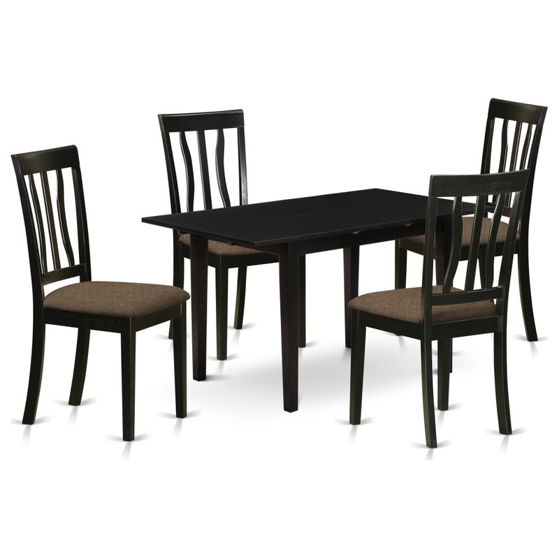 -The attractive kitchen set includes a lovely dinette table and 4 wonderful dining chairs. Our dining room chair is consisting of a Faux Leather seat and the back is slatted. This butterfly leaf small wooden dining table has a Black Rectangular top and Black 4 legs. This conventional dining room chairs and the wood table is suitable for any dining area.