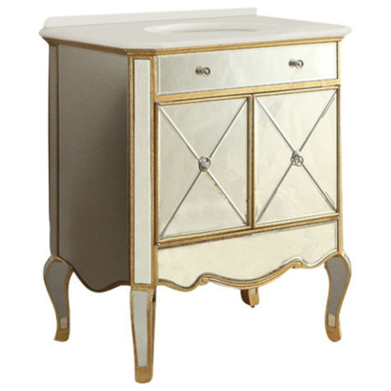 -This petite mirrored vanity will add elegance and function to your bath. A luxurious italian carrara marble crowns this charming bathroom addition. An under-mount white sink highlights the overall allure of this masterfully crafted hand finished piece, featuring a mirrored double door cabinet providing ample storage space standard pre-drilled holes and big back cutout allow for easy plumbing installation.