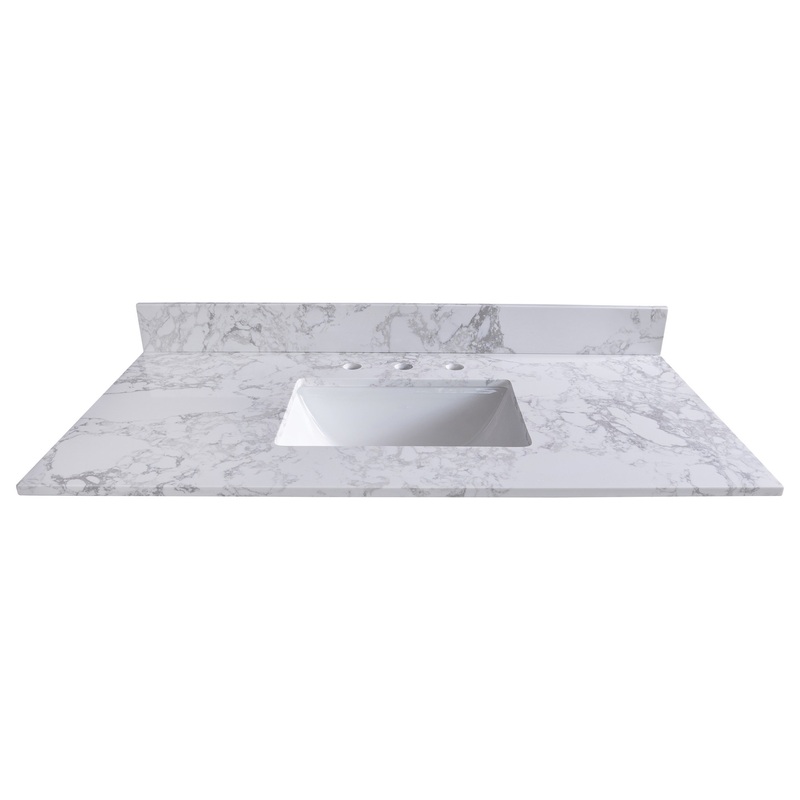 Elegant and Stylish Top- Warmly elegant and stylish Carrara-engineered stone vanity top complements most bathroom designs and coordinates with both light and dark cabinetry High-end stone top Pre-sealed and Polished for added protection.
