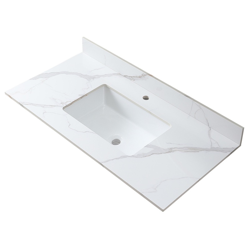The vanity tops are made of beautiful engineered stone. All exterior sides are polished for a luxurious look. Each model is complemented with a ceramic Rectangle under-mount sink. The matching backsplash is included in each package. Decorate your bathroom with this beautiful engineered stone vanity top, which includes a ceramic under-mount sink, a quick and easy way to complete your bathroom makeover. The vanity tops do not include a faucet and side splash.