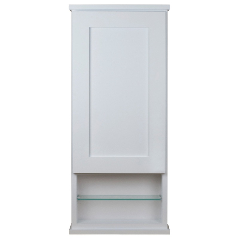 Mounts on the wall with steel mounting brackets inside for an easy installation. With two mounting methods, there is no need to worry about where the studs are in the wall. Four fully adjustable glass shelves slide into our patented shelf supports so they don’t tip or rock. Shaker style panel door sits on concealed hinges with soft close feature, door is reversible so you can mount it to open either direction. Cabinet portion is 22.5″ high INSIDE, open shelf is 11.25″ high INSIDE. Perfect as a medicine cabinet, spice cabinet, or storage cabinet anywhere. OVERALL Measurements are 37.5h x 15.25w x 6.25″d OVERALL. You’ll have nearly 5.5″ of depth INSIDE the cabinet. White enamel finish. Solid pine cabinet box with solid maple door. Proudly made in the USA.