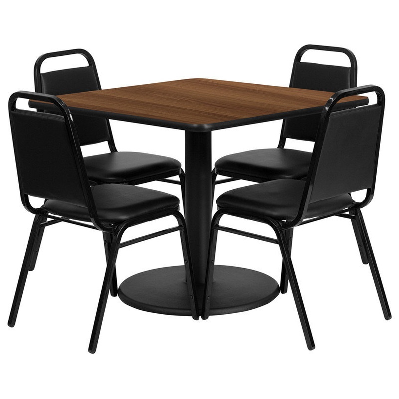 -Table and Chair Set -Set Includes 4 Banquet Chairs, Square Table Top and Round Base -Designed for Commercial and Home Use -Square Table -1.125" Thick Square Top -Walnut Laminate Finish -High Impact Melamine Core -Black T-Mold Protective Edging -24" Round