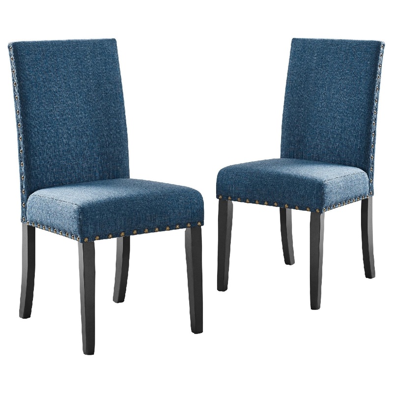 38 Inch Dining Chair with Nailhead Trim, Set of 2, BlueComfort meets transitional style with this beautiful dining room chair. Available in a set of two these stunning, marine blue chairs feature a padded seat and fluffy, cushioned backrest. The edges include a nailhead trim that gives the set a unique, striking charm. They are cushioned and upholstered with a soft polyester fabric and the frame is constructed of solid wood and veneer.
