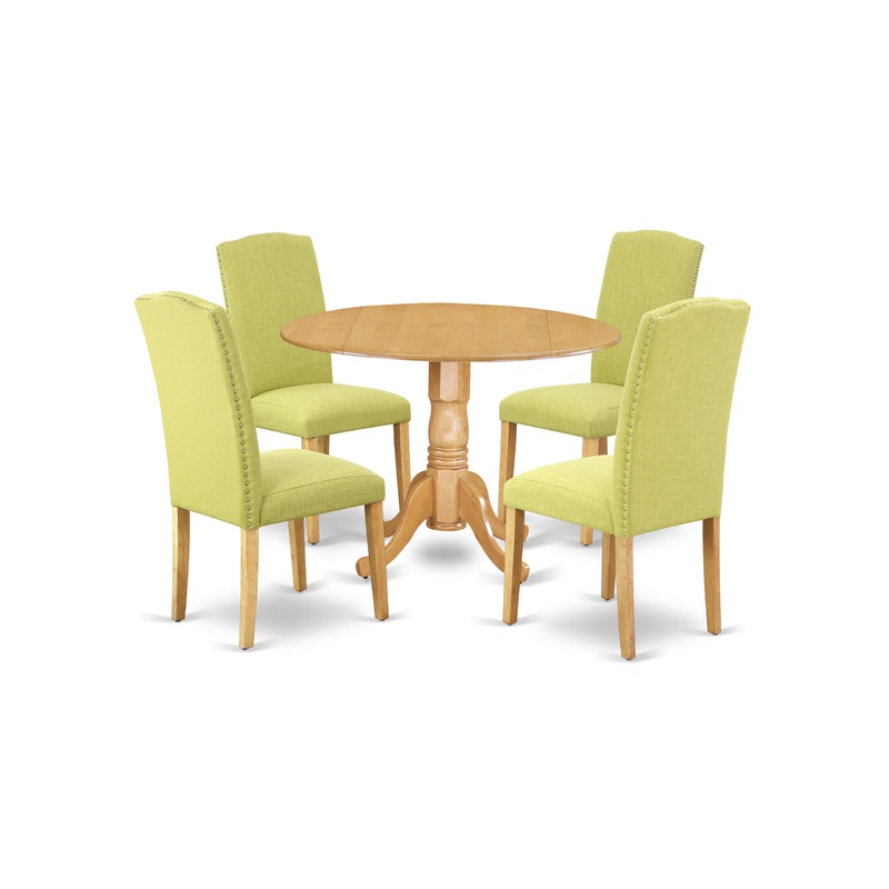 The DLEN5-OAK-07 kitchen set highlights the natural elegance of Asian wood. This fantastic round dining table features an elegant Oak color that complements a number of different attractive themes. The small kitchen table subtly reflects light to enhance the living area and showcase the dining room tables, kitchen dining chair. The drop down leaf can be easily expanded the kitchen table making more personal space for certain occasions or great parties. A single bevel edge and a rounded finish provide this dining room tables fits into a small kitchen space, great for compact apartments. The dinette table is created from prime quality rubber wood known as Asian Hardwood. This simple but charming Parson chair will add ambiance and style to your dining-room. A contemporary twist on a classic design, this eye-catching design will liven up any look. The traditional parson gives this chair a touch of familiar charm, while the Linen Fabric-Limelight color and clean-lined design elevate this chair with modern flair. The frame of the dinette chairs are engineered to offer a great amount of comfort to your spine and thus reduce the chances of back pain. Straight legs gives this design a hint of well-worn style, while its arched silhouette and nail head trim round out the look with classic character. Just by switching out your old dining set with this one, you can effortlessly refresh your dining space. This budget friendly dining set can be good choice for a great dining experience with family or friends.