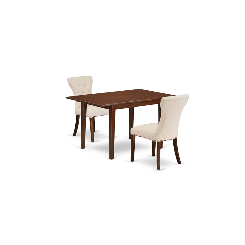 -[FINISH]: The wood dining table set coated in a rich Mahogany color versatile with any Dcor. This fashionable butterfly leaf dinette table and parsons chairs set color appears luxurious and retro. These parsons dining chairs have high stylish button tufted back with Light Beige color Linen Fabric seat cover and attractive wooden Mahogany color legs. Its rectangular dining table top and gorgeous wooden legs color is Mahogany finish.
