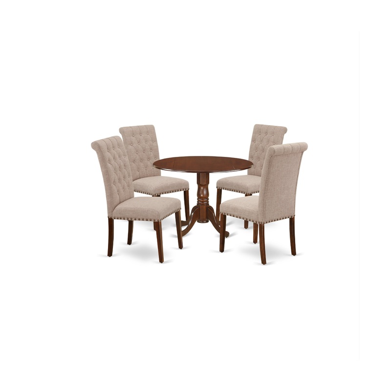 Enrich the elegance of your dining area with this DLBR5-MAH-04 dinette set includes a round dinette table and four parson chairs. The fantastic round dining table features mahogany color that complements a number of different attractive themes. The drop down leaf can be easily expanded the kitchen table making more personal space for certain occasions or great parties. A single bevel edge and a rounded finish provide this dining room tables fits into a small kitchen space, great for compact apartments. The dinette table is created from prime quality rubber wood known as Asian Hardwood. No heat treated pressured wood like MDF, particle board or veneer top fabricated. A regal and affordable Parson chair offers a touch of beauty to any dining room and provides a sensible seating arrangements. The upholstered dining chair features a beautiful stitched exterior. Tall back, Linen Fabric, high-density foam padding, solid hardwood frame construction, comfortable, durable and attractive. Whether you use this kitchen chair is an easy to assemble and stylish answer to your seating needs. The standard shape, size and design makes the dining area significantly attractive. This contemporary, budget friendly, durable and comfortable dinette set can be good choice if you are looking for a great dining time experience with your family or friends.
