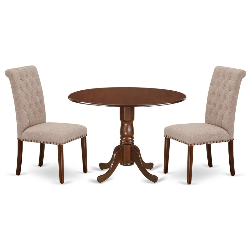 Enrich the elegance of your dining area with this DLBR3-MAH-04 dining set includes a round dinette table and two parson chairs. The fantastic round dining table features mahogany color that complements a number of different attractive themes. The drop down leaf can be easily expanded the kitchen table making more personal space for certain occasions or great parties. A single bevel edge and a rounded finish provide this dining room tables fits into a small kitchen space, great for compact apartments. The dinette table is created from prime quality rubber wood known as Asian Hardwood. No heat treated pressured wood like MDF, particle board or veneer top fabricated. A regal and affordable Parson chair offers a touch of beauty to any dining room and provides a sensible seating arrangements. The upholstered parson chair features a beautiful stitched exterior. Tall back, Linen Fabric, high-density foam padding, solid hardwood frame construction, comfortable, durable and attractive. Whether you use this dining chair is an easy to assemble and stylish answer to your seating needs. The standard shape, size and design makes the dining area significantly attractive. This contemporary, budget friendly, durable and comfortable dining set can be good choice if you are looking for a great dining time experience with your family or friends.