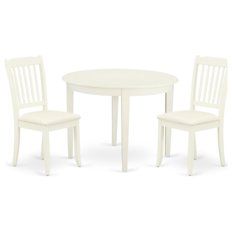 Bring the family charm in the dining area with this BODA3-WHI-C dinette set which highlights the natural elegance of Asian wood. A cozy and luxurious white color offers any dining-room a relaxing and friendly feel with the small kitchen table. With a soft rounded bevel at the edge of the table top, this well-designed and comfortable dinette table may be used for hours at a time. This small dining table requires a very little space and itd be a great choice if you are struggling with space in your dining area. Made up of rubber wood, the table is stable and offers a sturdy finish. This eye-catching Danbury dining room chair offers a modern and sophisticated look. The Kitchen dining chairs come with a Linen Fabic seat to fit personal preference and perfect design. This Stylish dining chair features curved front legs. Elegant kitchen chairs feature 7 vertical slats to give any dining area a touch of class and sophistication. Finished in luxurious Linen White Color. The standard shape, size and design makes the dining area significantly attractive. This budget friendly, durable and comfortable dining set can be good choice if you are looking for a great dining time experience with your family or friends.