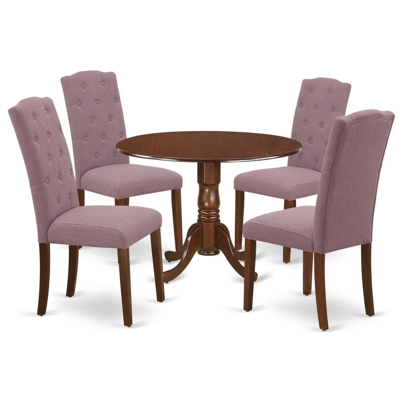Enrich the elegance of your dining area with this DLCE5-MAH-10 dinette set includes a round dinette table and four parson chairs. The fantastic round dining table features Mahogany color that complements a number of different attractive themes. The drop down leaf can be easily expanded the kitchen table making more personal space for certain occasions or great parties. A single bevel edge and a rounded finish provide this dining room tables fits into a small kitchen space, great for compact apartments. The dinette table is created from prime quality rubber wood known as Asian Hardwood. No heat treated pressured wood like MDF, particle board or veneer top fabricated. A regal and affordable Parson chair offers a touch of beauty to any dining room and provides a sensible seating arrangements. The upholstered dining chair features a beautiful stitched exterior. Tall back, Linen Fabric, high-density foam padding, solid hardwood frame construction, comfortable, durable and attractive. Whether you use this kitchen chair is an easy to assemble and stylish answer to your seating needs. The standard shape, size and design makes the dining area significantly attractive. This budget friendly, durable and comfortable dinette set can be good choice if you are looking for a great dining time experience with your family or friends.