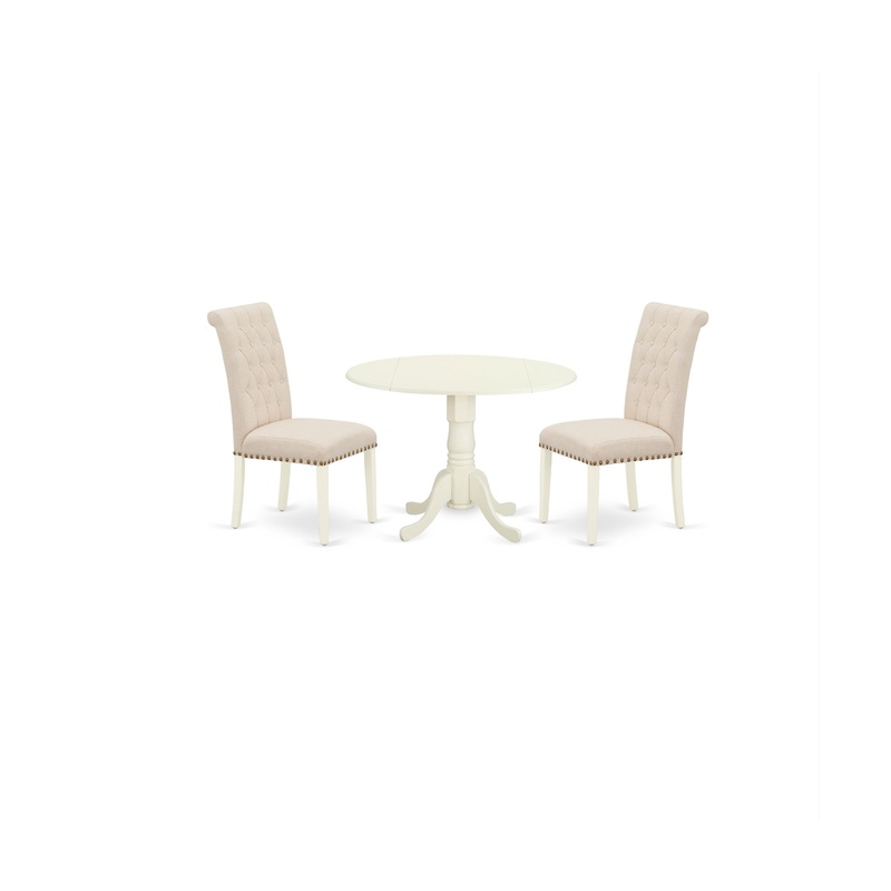 Enrich the elegance of your dining area with this DLBR3-WHI-02 dining set includes a round dinette table and two parson chairs. The fantastic round dining table features linen white color that complements a number of different attractive themes. The drop down leaf can be easily expanded the kitchen table making more personal space for certain occasions or great parties. A single bevel edge and a rounded finish provide this dining room tables fits into a small kitchen space, great for compact apartments. The dinette table is created from prime quality rubber wood known as Asian Hardwood. No heat treated pressured wood like MDF, particle board or veneer top fabricated. A regal and affordable Parson chair offers a touch of beauty to any dining room and provides a sensible seating arrangements. The upholstered parson chair features a beautiful stitched exterior. Tall back, Linen Fabric, high-density foam padding, solid hardwood frame construction, comfortable, durable and attractive. Whether you use this dining chair is an easy to assemble and stylish answer to your seating needs. The standard shape, size and design makes the dining area significantly attractive. This contemporary, budget friendly, durable and comfortable dining set can be good choice if you are looking for a great dining time experience with your family or friends.