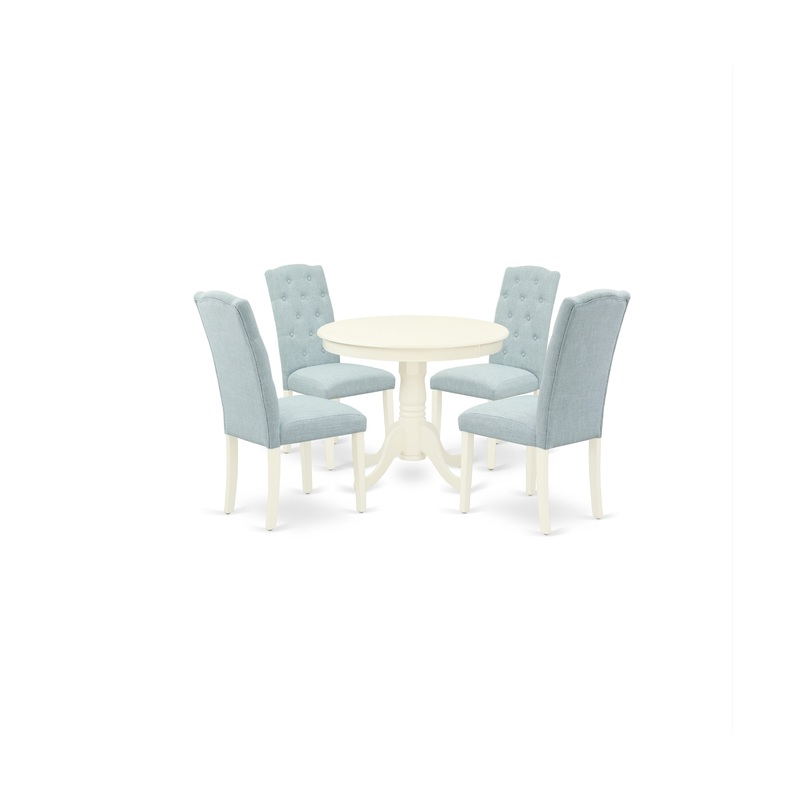 Dcor your dining room with this stylish ANCE5-LWH-15 dinette set includes a small dining table and four parson chairs. A cozy and luxurious Linen White color offers any dining-room a relaxing and friendly feel with the small kitchen table. The rounded shape table features a pedestal base that will furnish your dining area with a sophisticated look. With a soft rounded bevel at the edge of the table top, this well-designed and comfortable kitchen dinette table may be used for hours at a time. This small dining table requires a very little space and itd be a great choice if you are struggling with space in your dining area. Made up of rubber wood, the table is stable and offers a sturdy finish. A regal and affordable Parson chair offers a touch of beauty to any dining room and provides a sensible seating arrangements. The upholstered dining chair features a beautiful stitched exterior. Tall back, Linen Fabric, high-density foam padding, solid hardwood frame construction, comfortable, durable and attractive. Whether you use this kitchen chair is an easy to assemble and stylish answer to your seating needs. The standard shape, size and design makes the dining area significantly attractive. This budget friendly, durable and comfortable dinette set can be good choice if you are looking for a great dining time experience with your family or friends.