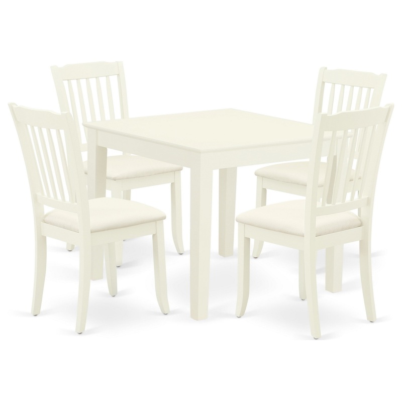 A traditional design gets a contemporary update in this stylish OXDA5-LWH-C dinette set. This specific 5Pc dinette set includes a kitchen table and four kitchen chairs. The fresh and clean lines dominate the cutting-edge design of the square small dining table of this elegant kitchen Set. To complement the dining room table’s square beveled tabletop, the linen white finish gives you the glimmer and shadows on the small kitchen table’s legs with various contours and ridges for an antique dining room table set. Made up of prime quality rubber wood, the table is stable and offers a sturdy finish. No heat treated pressured wood like MDF, particle board or veneer top fabricated. This eye-catching Danbury dining room chair offers a modern and sophisticated look. The kitchen chairs come with a Linen Fabic seat to fit personal preference and perfect design. This Stylish dining chair features curved front legs. Elegant dinette chairs feature 7 vertical slats to give any dining area a touch of class and sophistication. Finished in luxurious Linen White Color. The standard shape, size and design makes the dining area significantly attractive. This budget friendly, durable and comfortable dinette set can be good choice if you are looking for a great dining time experience with your family or friends.