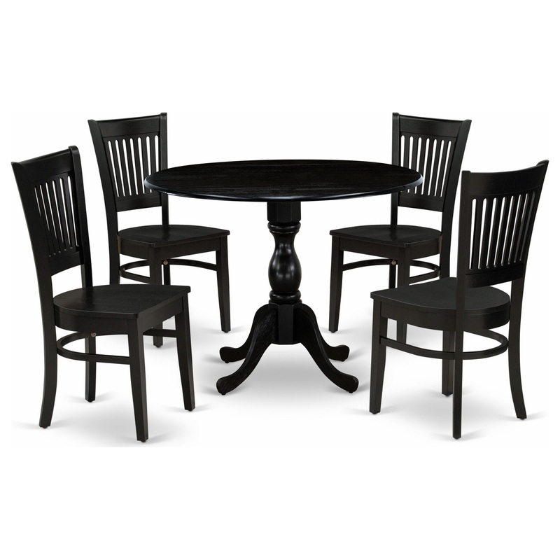 This 5-pc kitchen dining set includes 4 dining chairs and 1 drop leaves modern kitchen table. These dining chairs have a wooden seat, Slatted Chair Back, and the kitchen dining table includes a round tabletop and pedestal Legs. We have created these dining