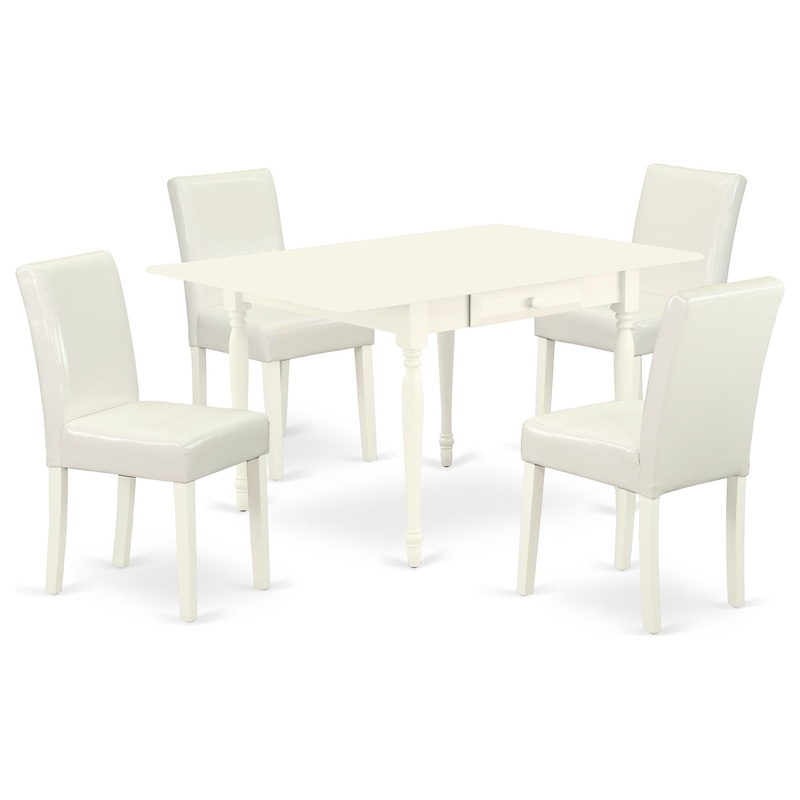 Turn your house into a home with this distinctive and sophisticated 1MZAB5-LWH-64 dining set. Created in the transitional style, the dinette set will be a welcome area for your family and friends to gather during meals and social activities. The convenient 5 piece kitchen set includes a dining room table and four parson chairs. Crafted from Asian tropical hardwood better known as rubberwood, the rectangular wooden table finished in luxurious linen white color has smooth edges and designed rounded legs for an advanced style. The Kitchen table includes two 9-inch drop down leaves that provides additional space for extra food trays and drinks. The 2 drawers of the dining table amplify storage in the kitchen or dining room to help keep you organized. The dining table can be assembled without any extra tools and aim to last for long. This simple but delightful Parson chair will add ambiance and fashion to your kitchen room. Provide your home a pop of chic style with this must-have dining chair. A contemporary twist on a timeless design, this eye-catching design will liven up any look. The timeless parson gives this chair a touch of familiar charm, while the PU Leather in white color and clean-lined design elevate this kitchen chair with a modern flair. Replacing the old kitchen set with this one, you can effortlessly refresh your dining area. To craft a new aesthetic, this rubberwood table in your dining room with these sleek chairs would be a perfect choice.
