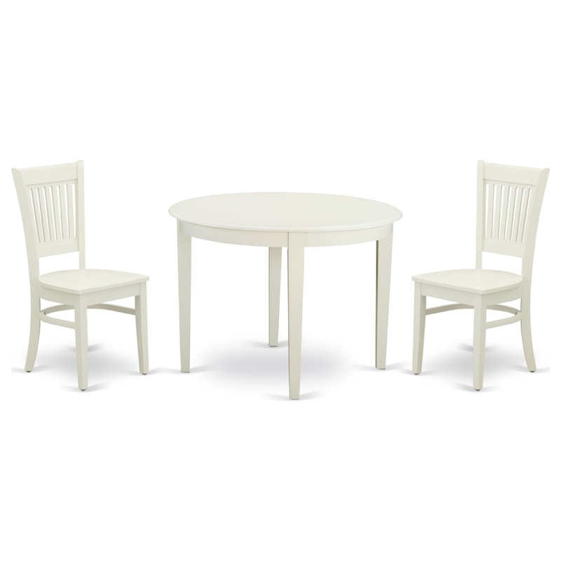 -Our dining set consists of a gorgeous small table and 2 beautiful kitchen chairs. This dining room chairs include an Linen White solid wood seat and the back is slatted. This dining table has Linen White Round top and Linen White 4 legs. This traditional dining room chair and the wood dining table are perfect for any dining-room.