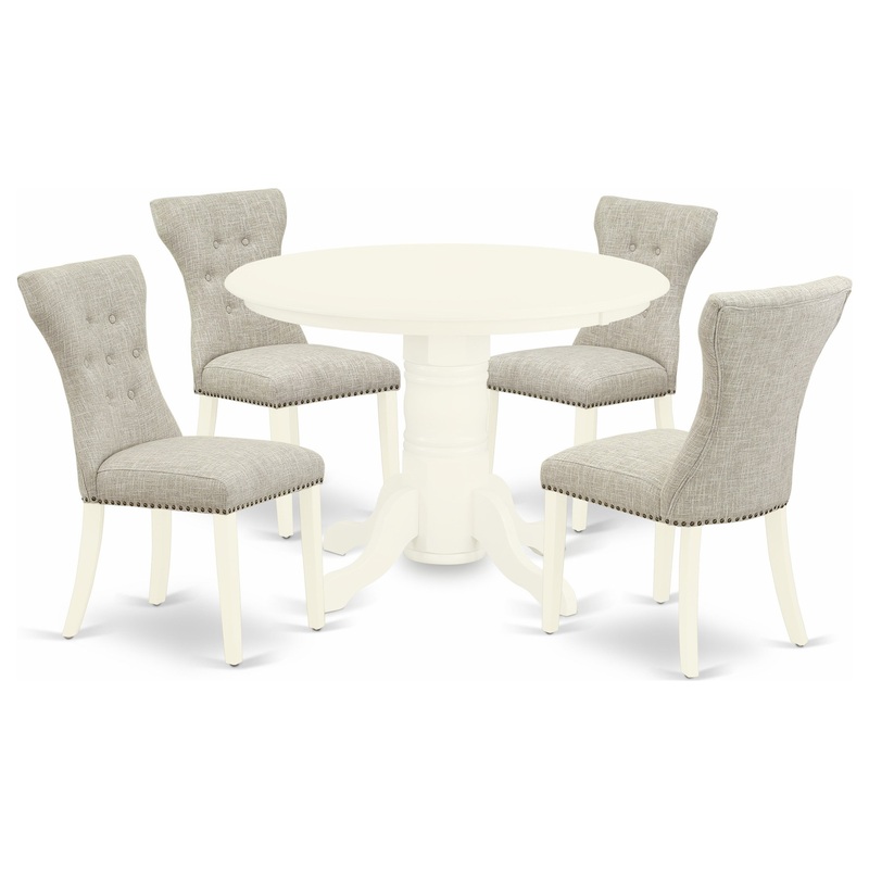 This dining room table set includes 4 remarkable parson chairs and a great pedestal legs wood table. The modern dining table set delivers a Linen White solid wood dining table and frame and an excellent DOESKIN parson dining chairs seat and high back that