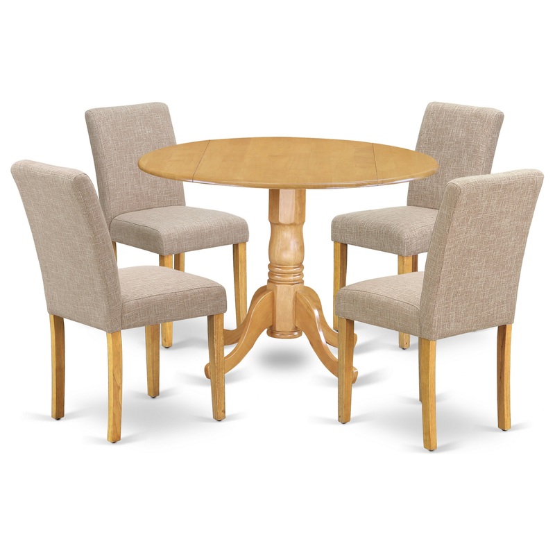 The DLAB5-OAK-04 kitchen set highlights the natural elegance of Asian wood finished in gorgeous Oak color. This fantastic round dining table features an elegant Oak color that complements a number of different attractive themes. The small kitchen table subtly reflects light to enhance the living area and showcase the dining room tables, kitchen dining chair. The drop down leaf can be easily expanded the kitchen table making more personal space for certain occasions or great parties. A single bevel edge and a rounded finish provide this dining room tables fits into a small kitchen space, great for compact apartments. The dinette table is created from prime quality rubber wood known as Asian Hardwood. No heat treated pressured wood like MDF, particle board or veneer top fabricated. This simple but charming Parson chair will add ambiance and style to your dining-room. A contemporary twist on a classic design, this eye-catching design will liven up any look. The traditional parson gives this chair a touch of familiar charm, while the fabric-Light Fawn color and clean-lined design elevate this chair with modern flair. Replacing the old dining set with this one, you can effortlessly refresh your dining space. Made of high-quality hardwood, the dinette chairs are engineered to offer a great amount of comfort to your spine and thus reduce the chances of back pain. This budget friendly, durable and comfortable dining set can be good choice for a great dining experience with family and friends.