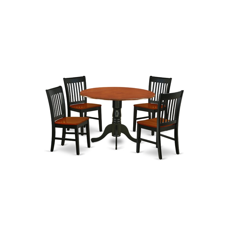 The DLNO5-BCH-W kitchen dinette set brings the elegance of Asian wood in the dining area. This fantastic round dining table features elegant Black and Cherry color that complements a number of different attractive themes. The drop down leaf can be easily e