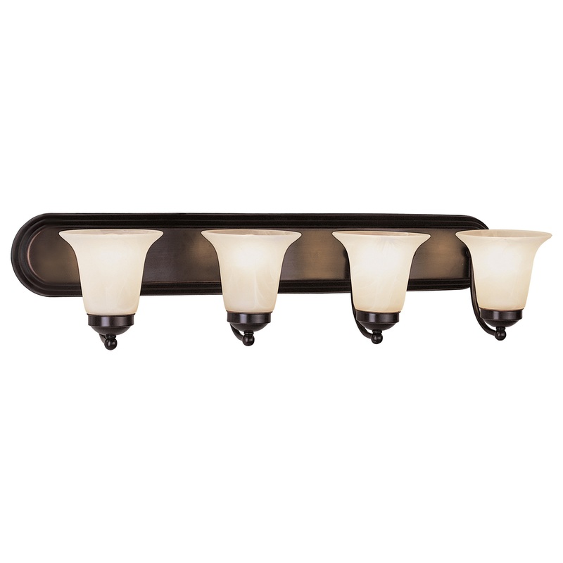 The Rusty Collection offers a sleek look with a high quality finish. The four light Rusty 30″ Vanity Bar emanates a warm glow, while providing ample task lighting for any bath or powder room. The Rusty Collection features include Marbleized Glass shades, curved arms with knobbed ends, and decorative oval wall plate. This simple yet sophisticated style will complement a wide variety of decor and is easy to coordinate with your existing pieces.