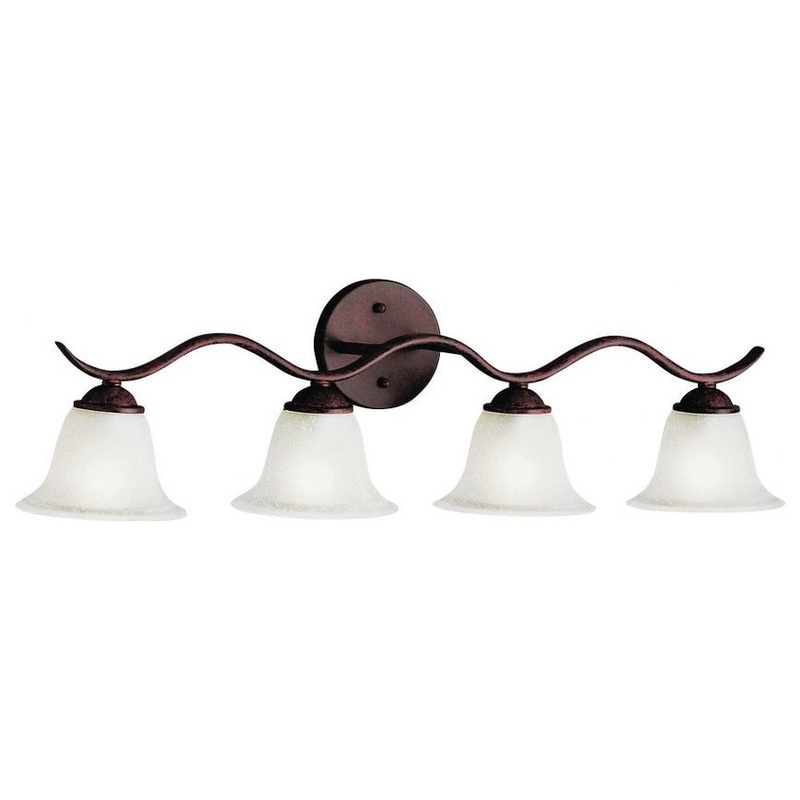 -4 light Bath Strip with Transitional inspirations 8.75 inches tall by 30.5 inches wide-Tannery Bronze Finish . Bulb Not IncludedBathe your bathroom in a wave of light with this unique 4-light Bath bar from BaileyStreetHome. The fixture’s bar utilizes a fluid design with Brushed Nickel finish while Etched seedy glass covers 100-watt (max) bulbs. It measures 30 ” wide and can be installed with the glass up or down allowing you to customize the look as you see fit.