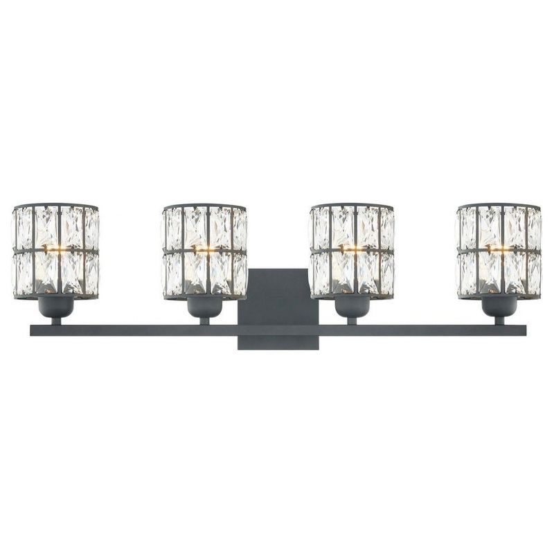 4 Light Extra Large Vanity Light . Add a glamourous touch to your bathroom with the Buttercup Woodlands collection. The cylindrical shades are made up of faceted crystals that pop against the Matte Black finish giving this fixture a chic and eye-catching d