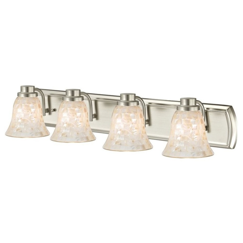-4-Light Mosaic Glass Bath Wall Light in Satin NickelSatin nickel 4-light bathroom light with bell shaped mosaic glass. Takes four 100-watt maximum rated medium base A19 frosted light bulbs (not included). Suitable for installation in dry and damp location