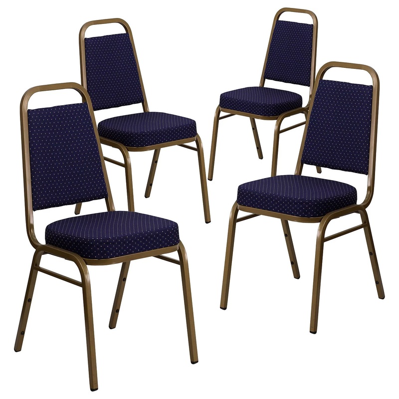 -Set of 4 Multipurpose Trapezoid Back Banquet Chairs for All Occasions -2.5" Thick Seat Cushion with CAL 117 Fire Retardant Foam -16 Gauge Steel Frame with bumper guards to protect finish while stacked -Floor Protector Plastic Glides -Designed for Commerci