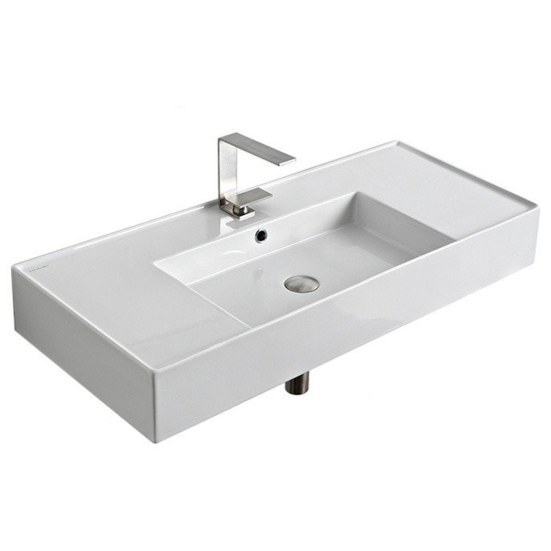 This 40 inch modern ceramic bathroom sink features counter space on both the right side and left side of the basin. Use this sink as a wall mounted or vessel sink. Bathroom sink features an overflow and standard drain size of 1.25 inches. Available in one