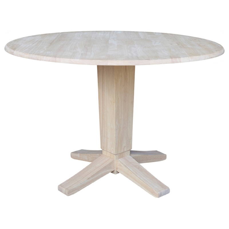 Create an atmosphere for an intimate conversation for two or a family Sunday dinner with this versatile drop leaf dining table set from International Concepts Furniture. This table set is part of a high-quality collection of wood furniture that will easily complement any decor. Parawood, a hardwood known for its durable, strong, and environmentally friendly nature, is used to craft these classic table sets. This dropleaf table includes two, 9-inch drop leaves on either side of the table; its perfect for a compact kitchen or a spacious dining room. The table pairs well with these dining chairs from the International Concepts solid wood seating collection. Customize your perfect dining experience with this versatile dropleaf dining table set from International Concepts!Made from solid parawoodIncludes dual dropleaf table and 4 dining chairsDimensions: 42 in W x 42 in D x 30.3 in H9 in drop leaf on each side with a 24 in x 42 in center sectionPedestal base with 4 feet for maximum support