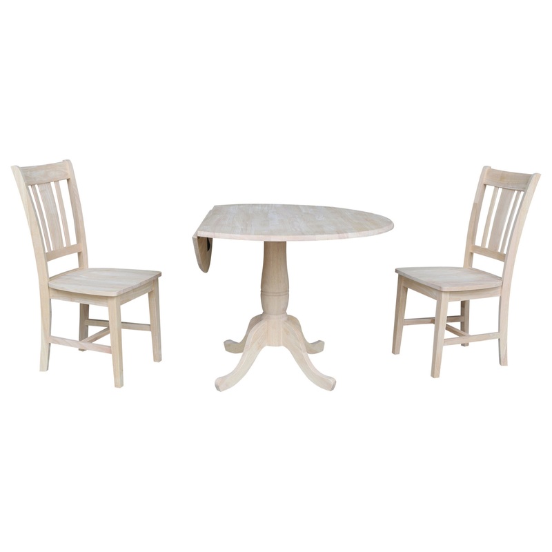 -Center is 42 inches with leaves up and 24 inches with both leaves downSome assembly requiredThis item is manufactured from raw,unfinishedwood. It can be painted, sealed, or stained any color you wish or you may leave itunfinished. The color of the raw wood may vary slightly based on the nature of the product.