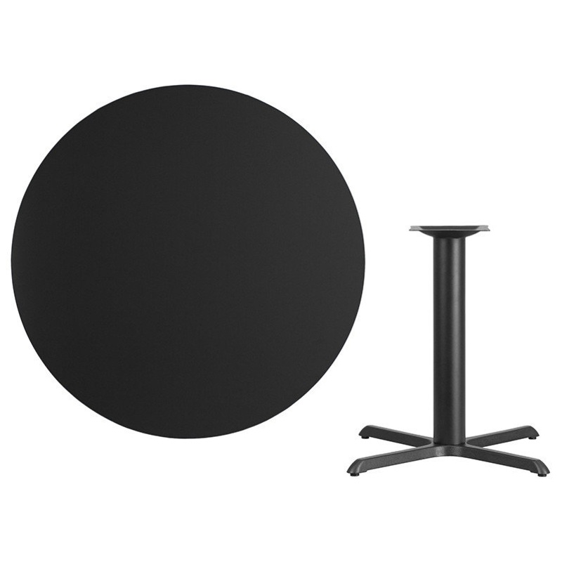 -Hospitality Table -Black Laminate Top -Top Size: 42"W x 42"D -1.125" Thick Top with melamine core -Black T-Mold Protective Edging -Heat, Scratch and Moisture Resistant -Clean top with mild detergent/water and cloth dry -33" x 33" Table X-Base with 4" Dia.