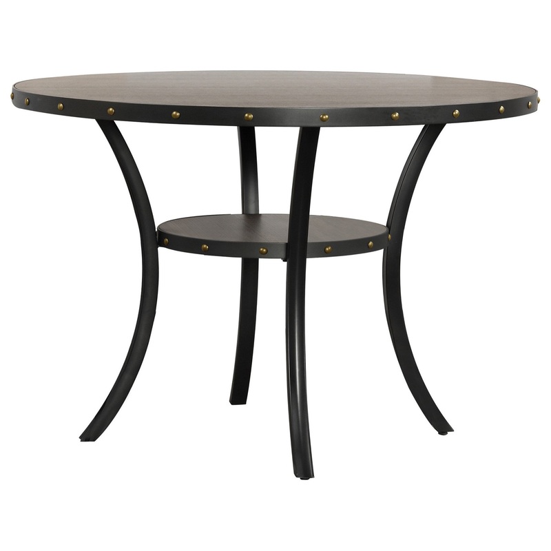 48 Inch Round Wood Dining Table with Flared Legs, GrayA bold statement for class and comfort, this 36 inch bar table features a smooth, black, rounded wood top and an open bottom shelf for simple and classically integrated storage. Rivets accent the glossy, smooth exterior and flared legs with a strong, industrial accent. Chairs sold separately.