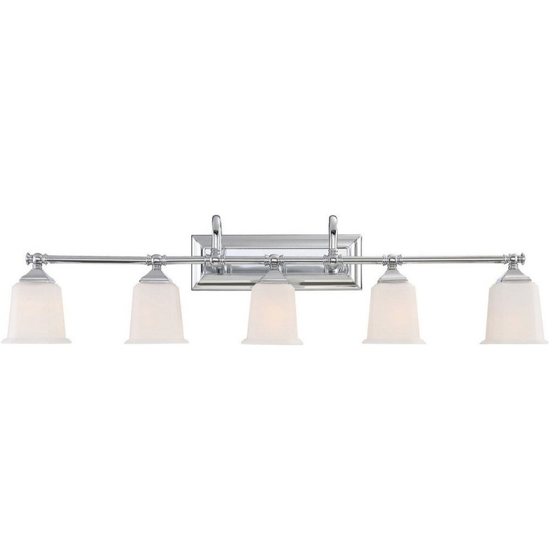 5 Light Transitional Bathroom Light Fixture Approved for Damp Locations-Polished Chrome Finish . Balmoral South BN Brushed Nickel Finish Bath Fixture With 5 Lights: This stunning collection gives a solid nod to mid century style. The squared shape of the opal etched glass shades gives this design an edge and it is complemented beautifully by the rectangular backplate.