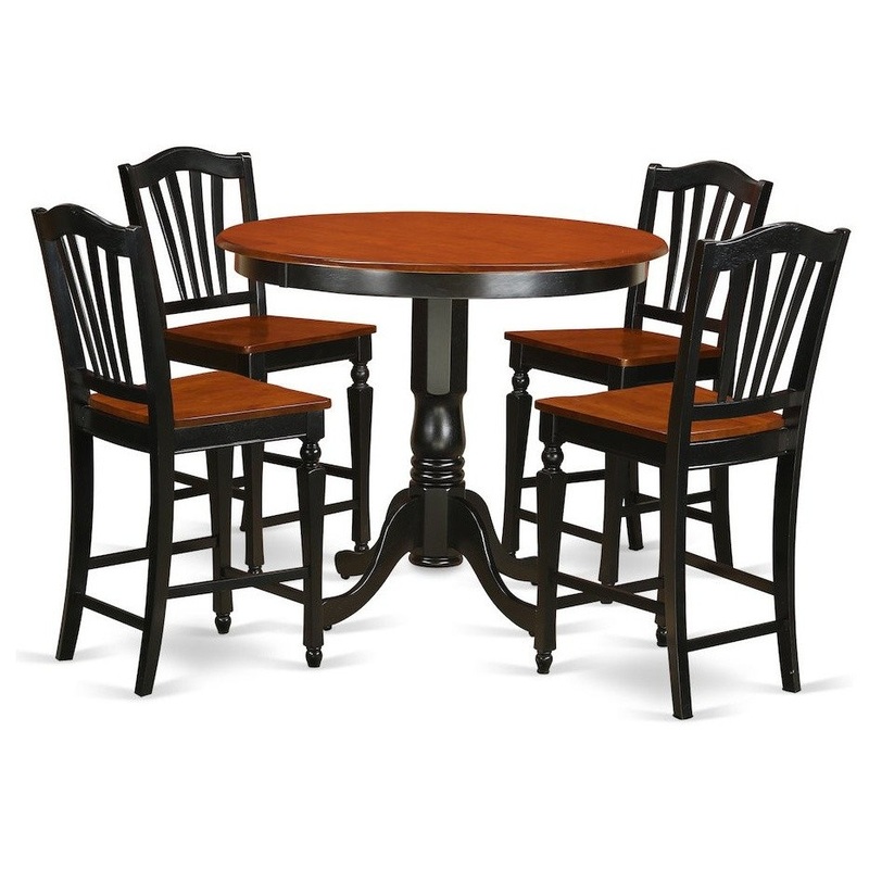-Package Includes: 5 Piece Subtle round counter height table together with 4 solid wood stools finish in a warm black color with wood seat.