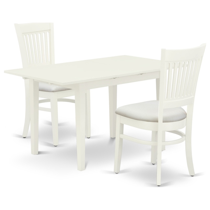 -Our attractive dining set contains a lovely small wooden dining table and 2 amazing dining room chairs. Our upholstered dining chairs are consisting of a Linen Fabric seat and the back is slatted. This butterfly leaf rectangle table has a Linen White Rectangular top and Linen White 4 legs. This standard wood dining chair and the dining room table is perfect for any dining area.