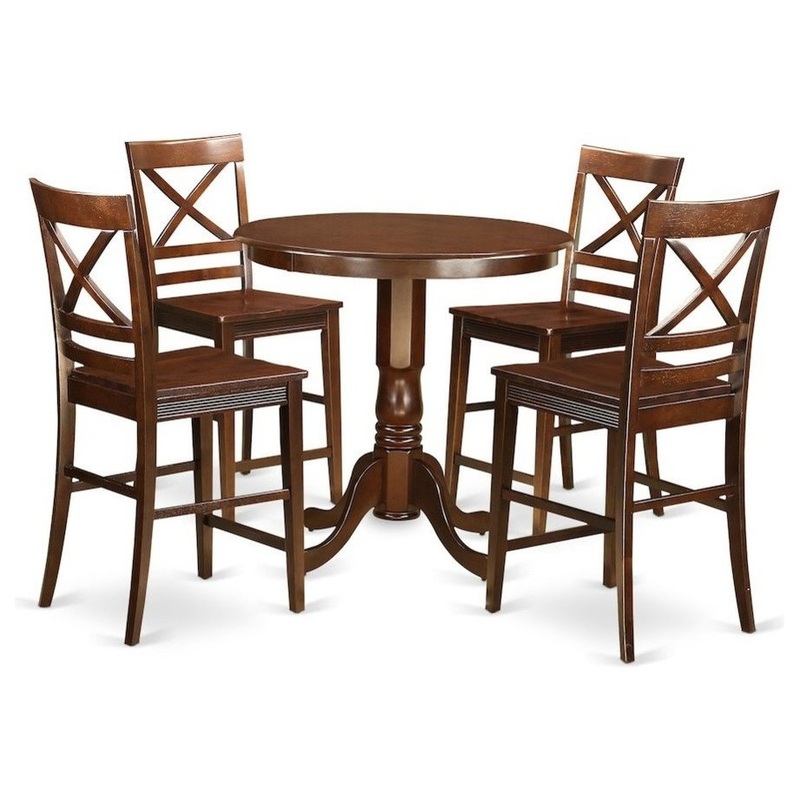 -Package Includes: 5 Piece Moderate counter height round kitchen table with 4 stable wood stools finish in a warm mahogany color with wood seat.