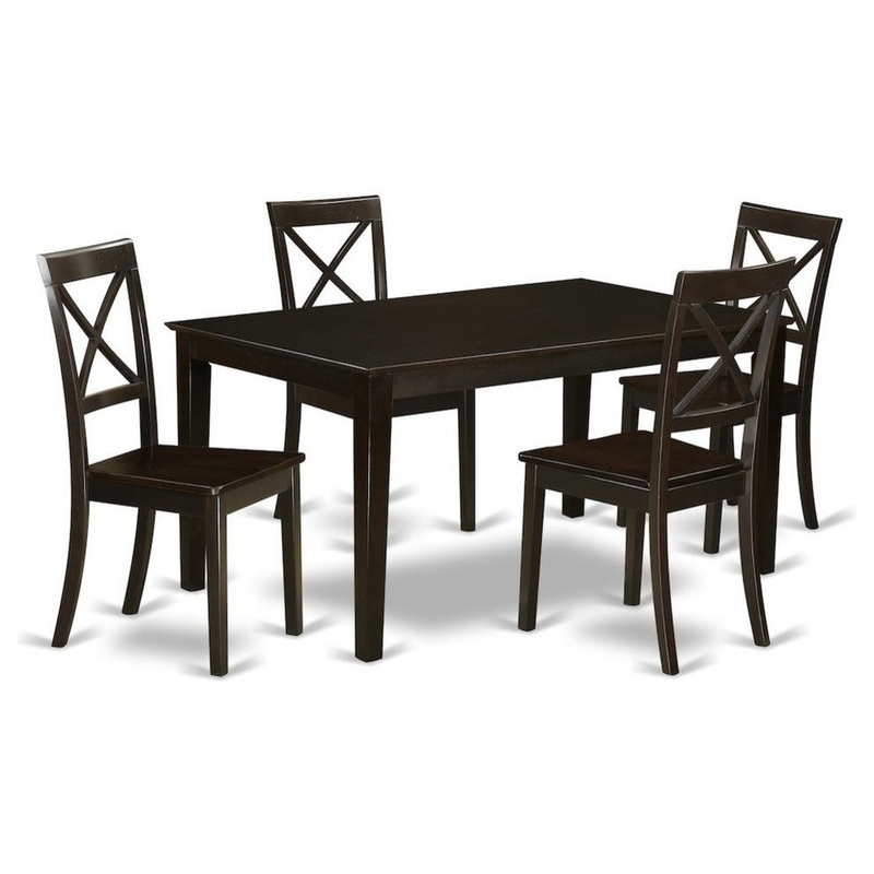 Modern but beautiful dining table set gives modern-day style for any kitchen. Cappuccino color dining room mixes set comes with a with fashionable as well as old-fashioned living area, adding a clean, organic and natural semblance. Simple attributes in addition to a more traditional finish complete eachother to produce an attractive although modern table set. Trim X back dining room chairs supply trendy and cozy seating, with hardwood seats which permit a nice and stylish dining experience. table and chairs set constructed with sheer Asian wood for remarkable stability and stability, providing a tough and beautiful long-term small dining table set solution. Dining room chair seats in either solid wood , microfiber upholstered, and last of all leather to accommodate taste and ideal designTable Dimensions: Length 60; Width 36; Height 30, Chair Dimensions: Length 17.5; Width 17; Height 38.5