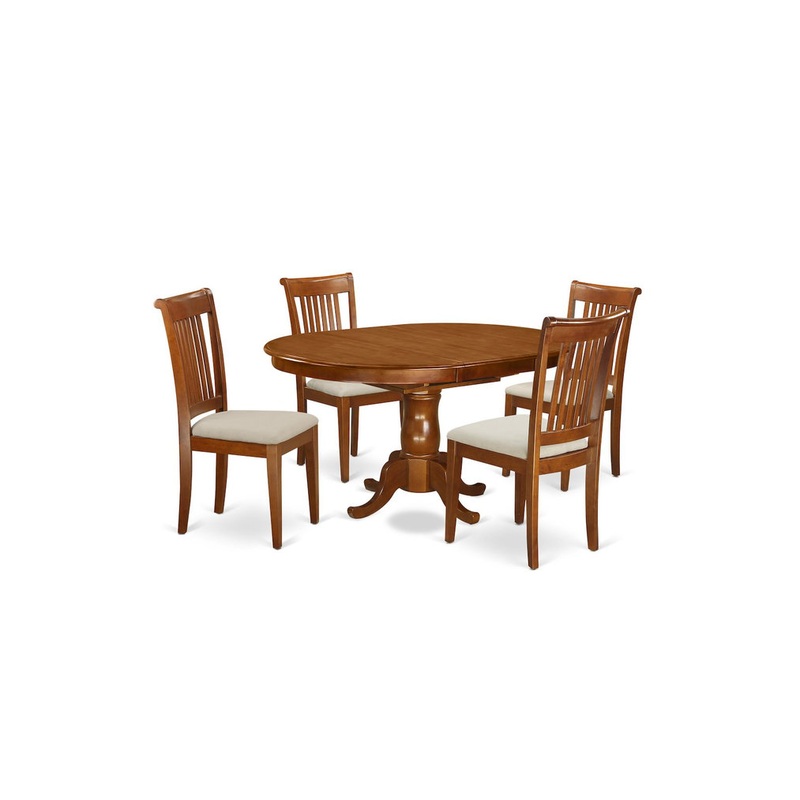 -Fabric: MicrofiberPackage Includes: This 5 piece dining room table set includes one oval dining table with 18in extension removable leaf and 4 matching dining chairs with either wood or upholstered seat of your choice.