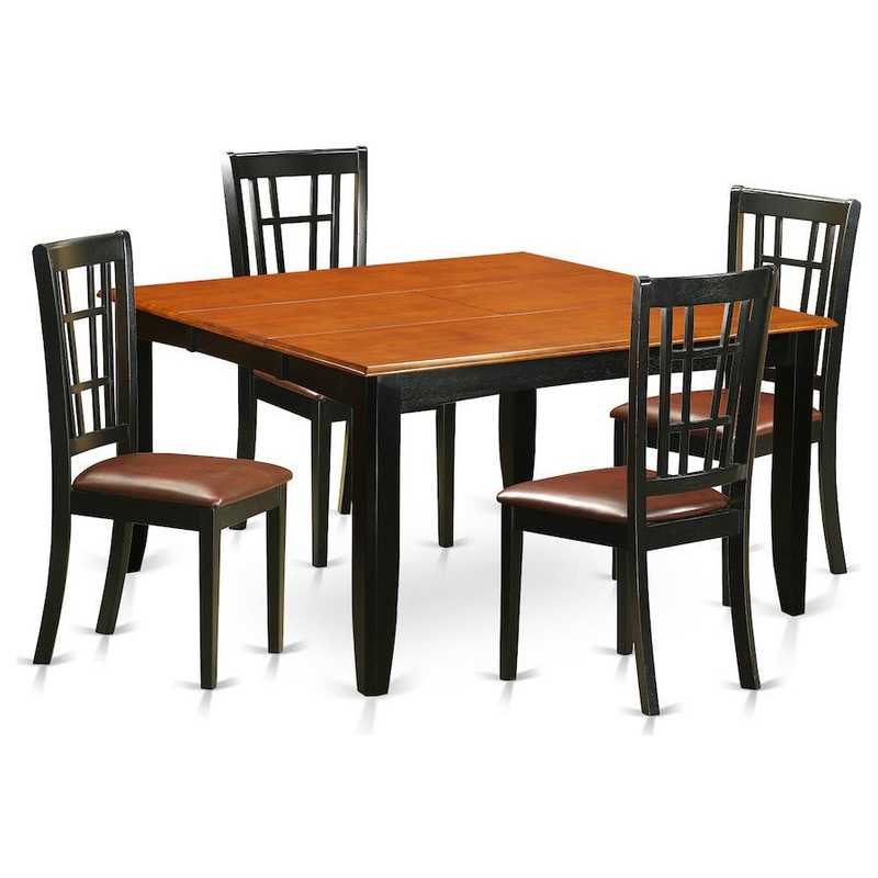-This 5 piece dining set Includes dining table and 4 faux leather seat dining room chairs finished in Black and Cherry.