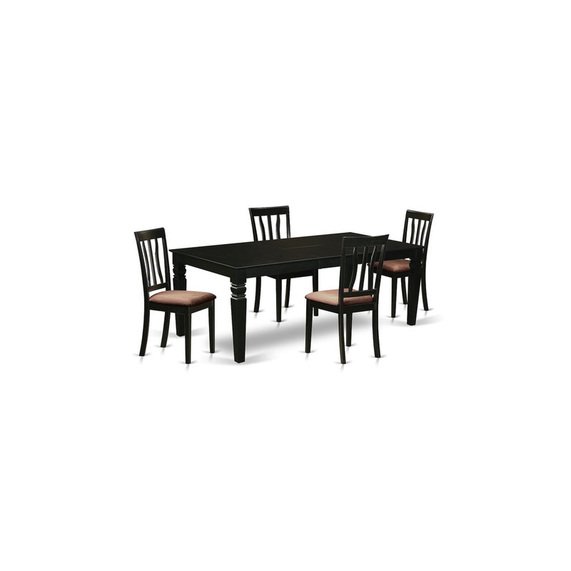 This gorgeous dining set is reminiscent of timeless missionary style and ads a classy, contemporary touch to any kitchen area or dining room. This kind of five piece dining table set with 1 table and 4 kitchen chairs. Top notch dining set which made out of 100% asian hardwood. Simply no MDF, veneer, laminate include with our items. This table integrated an 18 in self storage extension leaf which can be stored right beneath table top. The rectangular kitchen table is finished in a warm, high shine black which is easy to maintain and polish. This table features stable square legs with carved design and plenty of legroom for individual comfort. The straight back chairs are perfect for both formal and casual get together. 5 piece dining room set with one logan dining room table and 4 microfiber upholstery seat dining-room chairs finished in a rich black color.