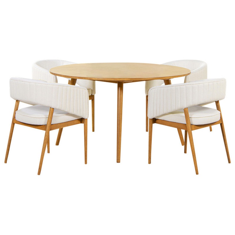Minimalistic and timeless, Jennifer Taylor Home 5-Piece Dining Set is perfect for modern contemporary style. Beautifully crafted from a solid natural light tan brown rubber wood, the frame shows off natural patterns and variation found in wood textures. The slender leg base is a nod to Mid-Century Modern design. This 5-Piece Dining set includes a 54-inch diameter round dining table and 4 open barrel eggshell white linen upholstered dining chairs.